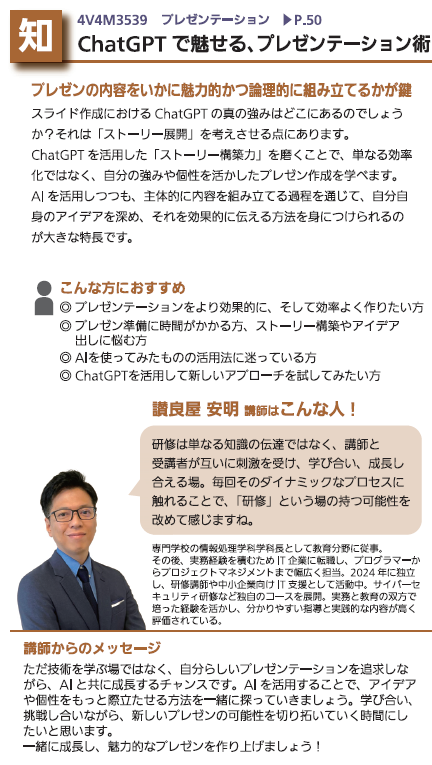 2025年度のパナソニックエレクトリック総研様のパンフレットに私のセミナー「ChatGPTで魅せる、プレゼンテーション術」が掲載されました。