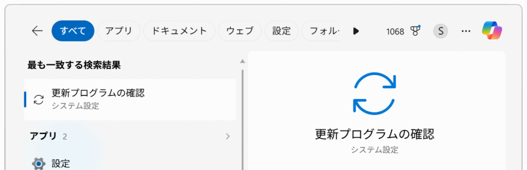 と、入力しましょう。すると、画面に「更新プログラムの確認」が表示されます。